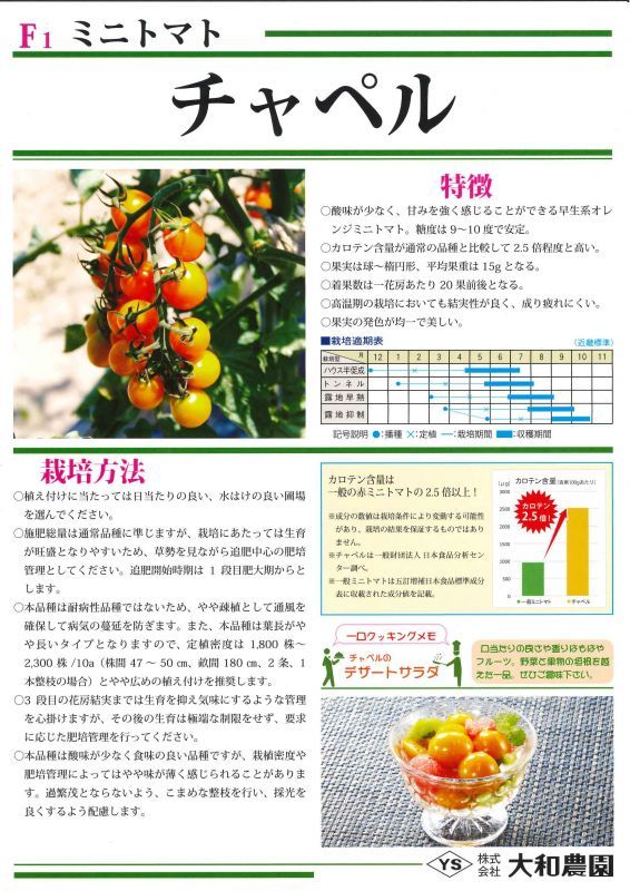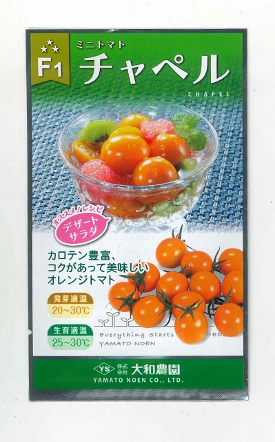 [トマト/ミニトマト] チャペルトマト 25粒 大和農園 [トマト/ミニトマト] チャペルトマト 25粒 大和農園 販売価格: 530円(税込) 数量: 1 2 3 4 5 6 7 8 9 10 11 12 13 14 15 16 17 18 19 20 21 22 23 24 25 26 27 28 29 30 31 32 33 34 35 36 37 38 39 40 41 42 43 44 45 46 47 48 49 50 51 52 53 54 55 56 57 58 59 60 61 62 63 64 65 66 67 68 69 70 71 72 73 74 75 76 77 78 79 80 81 82 83 84 85 86 87 88 89 90 91 92 93 94 95 96 97 98 99 返品特約に関する重要事項 お問い合わせ お気に入り登録 ●草勢は強く節間は中位で草丈は高い、栽培容易なミニトマトです。 ●早生種で、播種後約75日で収穫可能です。 ●結果力強く、1花房に30果以上着果します。 ●果実はやや高球型で鮮やかな橙黄色、果重15g前後、 ●糖度は9〜10前後と高く安定し、甘味が強く、食味が極めて良い品種です。 ●裂果やへた離れの発生が少なく、日持ちも良く市場性が高いミニトマトです。蒔き時期をご確認下さい。
