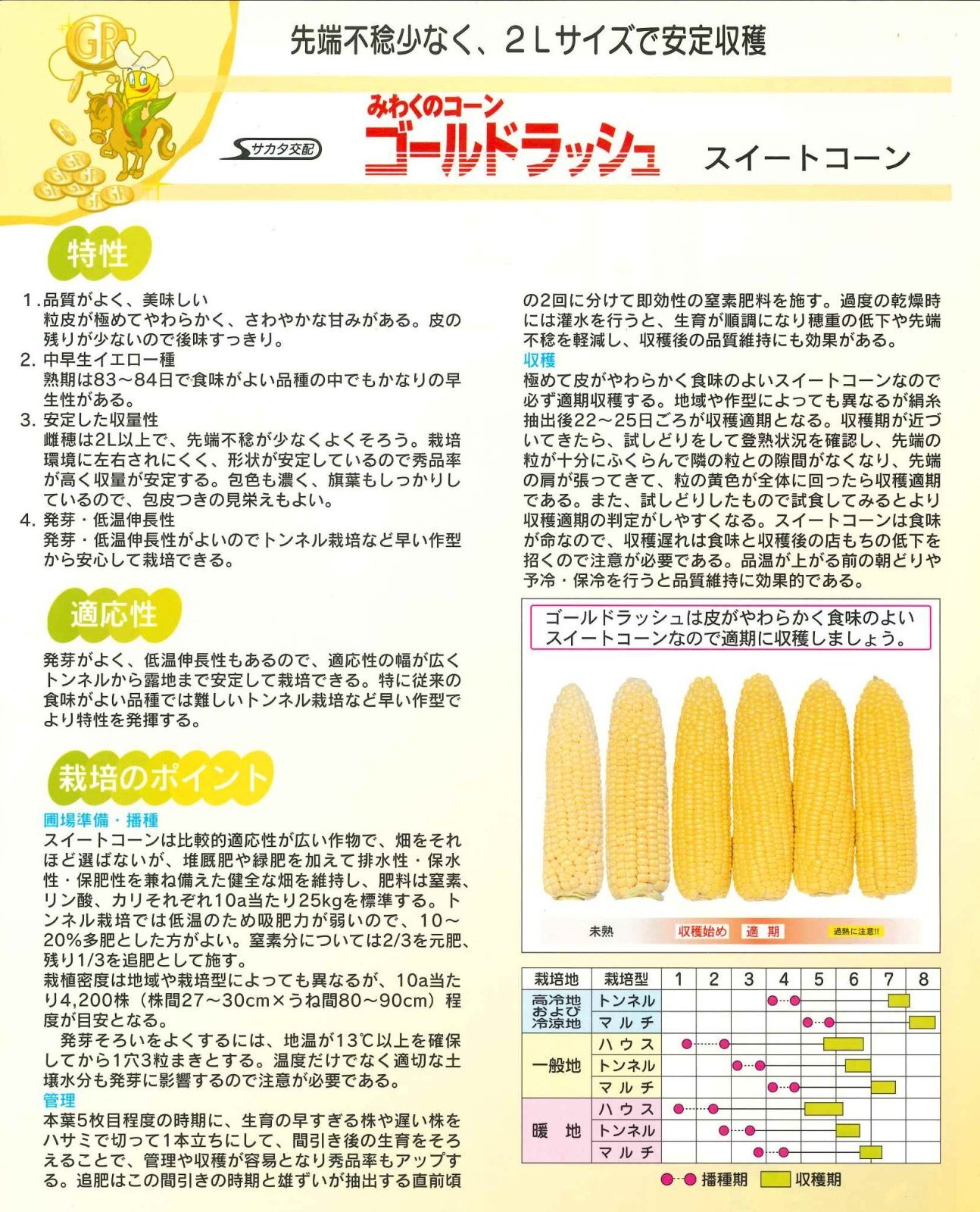 [とうもろこし] ゴールドラッシュ 2000粒 (株)サカタのタネ [とうもろこし] ゴールドラッシュ 2000粒 (株)サカタのタネ 販売価格: 7,440円(税込) 重量: 1000g 返品特約に関する重要事項 お問い合わせ お気に入り登録 2Lサイズで安定収穫! とにかく甘みが強くて当店ダントツ人気品種です!●83〜84日タイプの中早生イエロー種です 蒔き時期をご確認下さい。