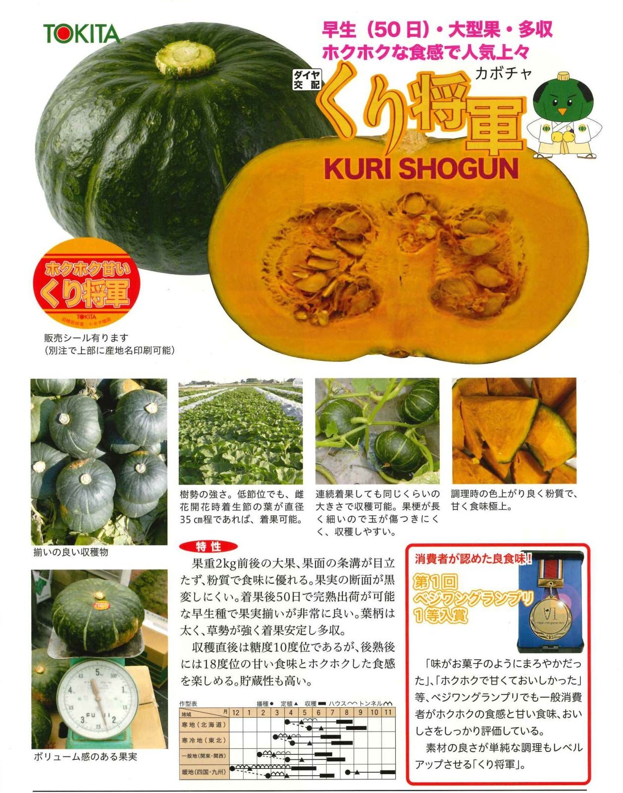 果重2kg前後の大果が2番、3番果でも着果後50から55日で収穫できる早生で多収の品種です。
