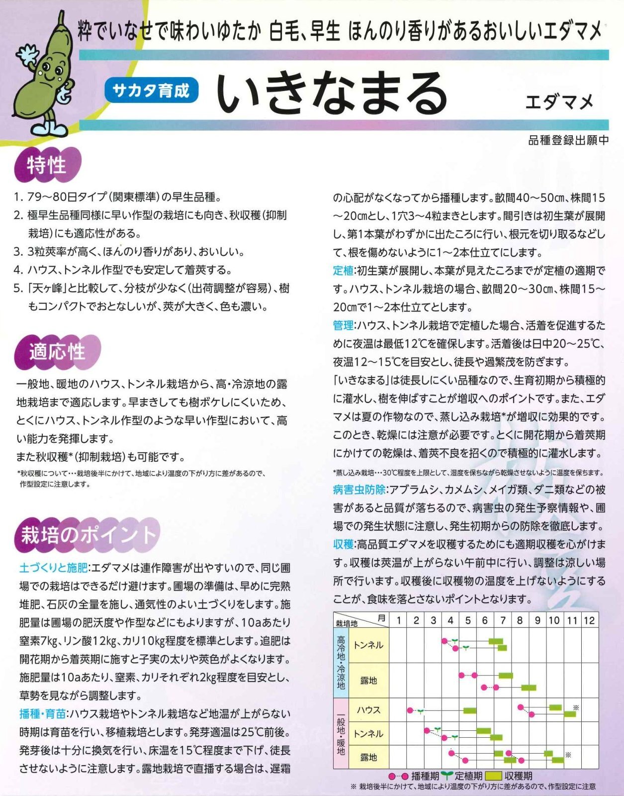 送料無料 [枝豆] いきなまる 約40粒 (株)サカタのタネ 実咲350 (003157) 送料無料 [枝豆] いきなまる 約40粒 (株)サカタのタネ 実咲350 (003157) 販売価格: 420円(税込) 返品特約に関する重要事項 お問い合わせ お気に入り登録 ●79〜80日タイプ(関東標準)の早生品種で、幅広い作型に適応する ●3粒莢率が高く、ほんのり香りがあるおいしい枝豆。 ●ハウス・トンネル作型でも安定して着莢するタイプ ●密植栽培に向く品種であり、密植した方が(株間15cm程度)樹が伸びて 収量も増加する 蒔き時期は上記を参考にしてください。