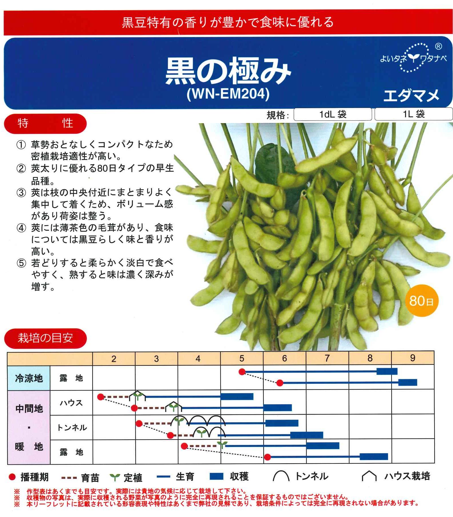 送料無料 [枝豆]おいしい枝豆とれました黒の極み 1dl (およそ180粒) 渡辺農事(株) 送料無料 [枝豆]おいしい枝豆とれました黒の極み 1dl (およそ180粒) 渡辺農事(株) 販売価格: 560円(税込) 返品特約に関する重要事項 お問い合わせ お気に入り登録 特性 ●草勢がおとなしくコンパクトなため、密植栽培適性が高い。 ●莢太りに優れる80日タイプの早生品種。 ●莢は中央付近にまとまりがよく集中してつき、ボリューム感があり荷姿が整う。 ●莢には薄茶色の毛じがあり、食味は黒豆らしい味と香りが高い。 蒔き時期は上記を参考にしてください。