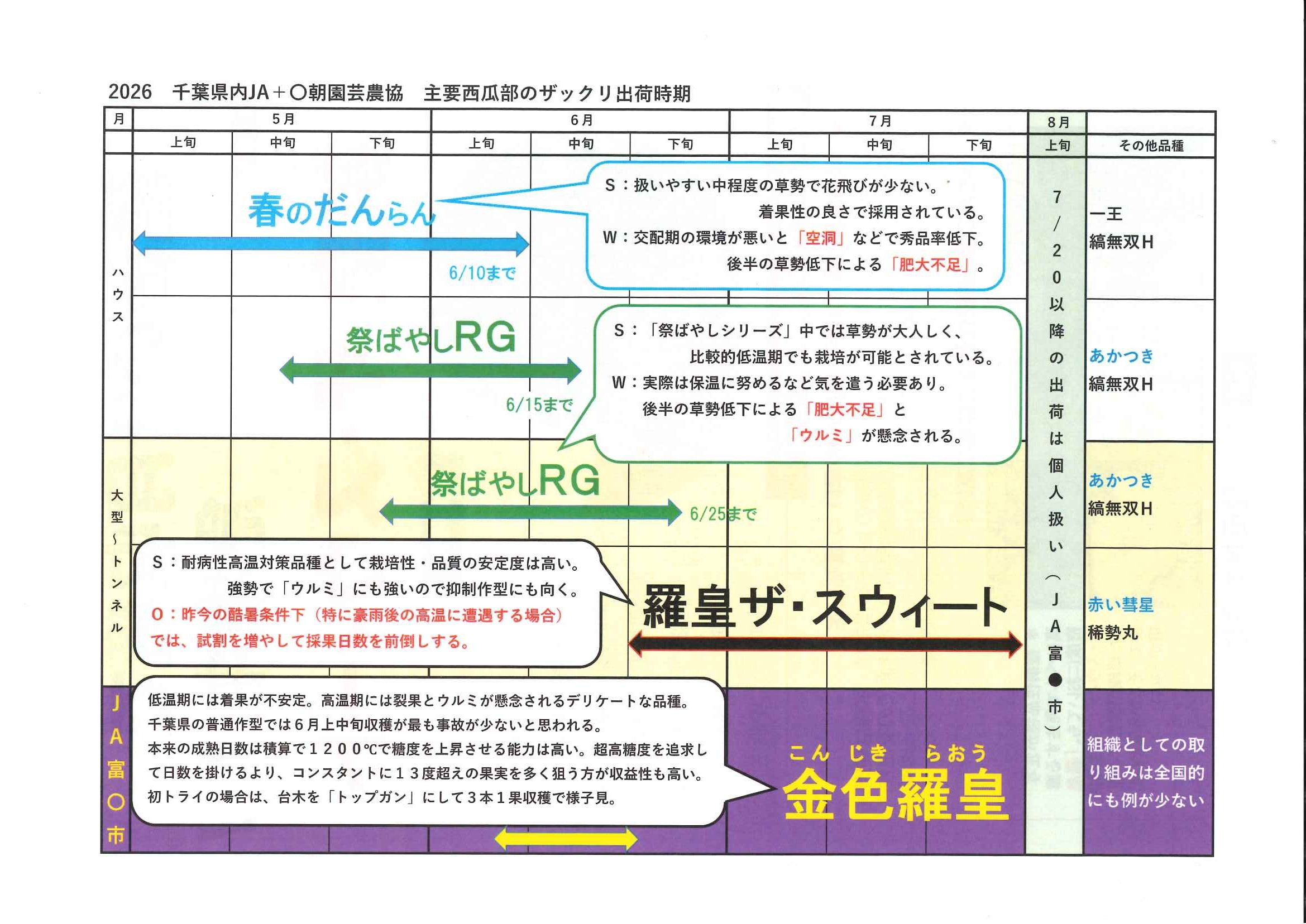 ◎草勢は強く、6〜7月収穫のトンネル栽培で開花後48〜49日程度で収穫となる中晩生種。